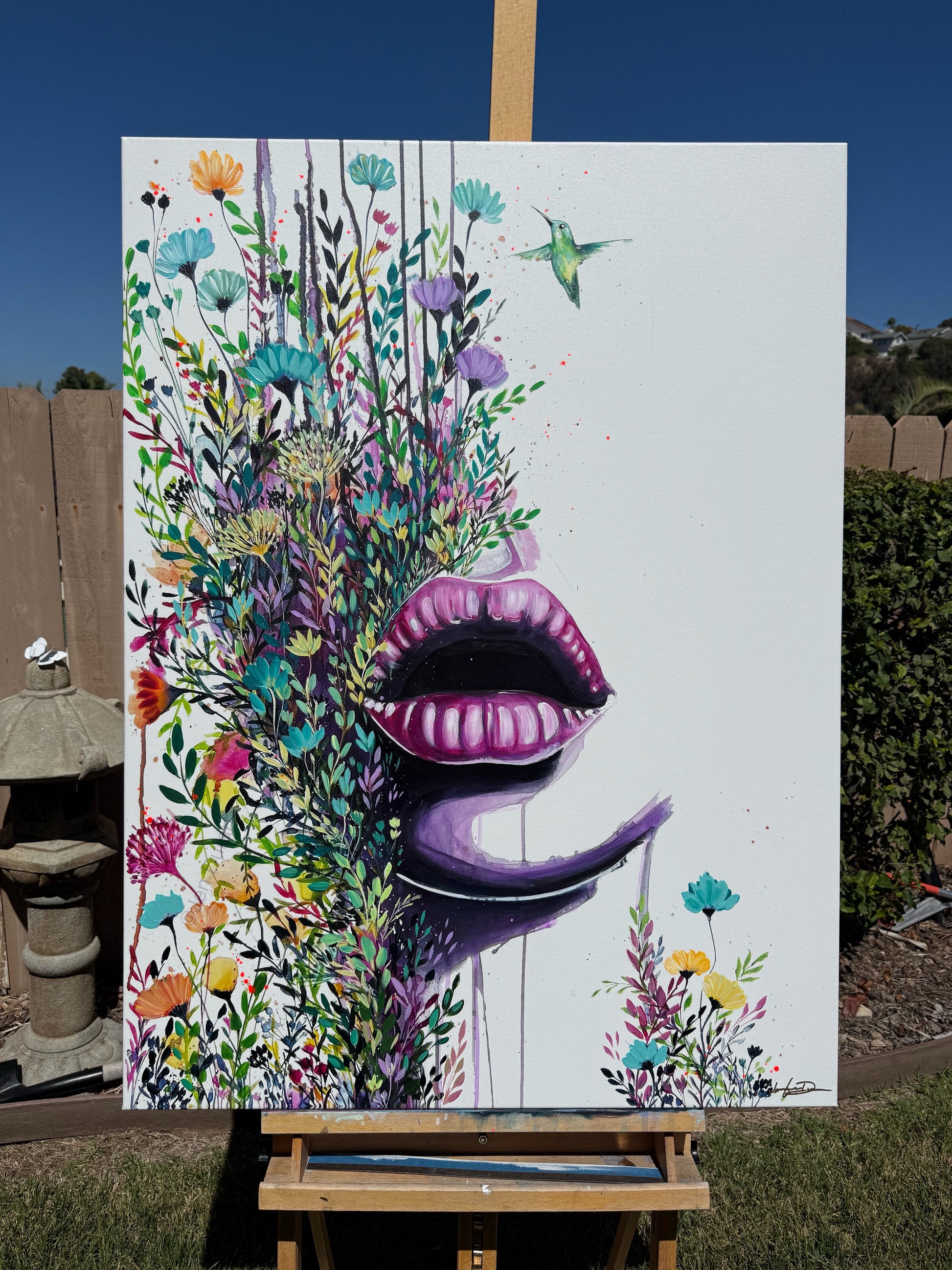 “Be Free” bursts with untamed energy—lush florals spilling outward in vivid hues of magenta, teal, yellow, and green. At the center, bold violet lips open as if mid-song, releasing a voice of freedom. A small hummingbird hovers nearby, embodying lightness, joy, and possibility. This painting is a celebration of expression, vitality, and the wild beauty of living unapologetically in full bloom.
