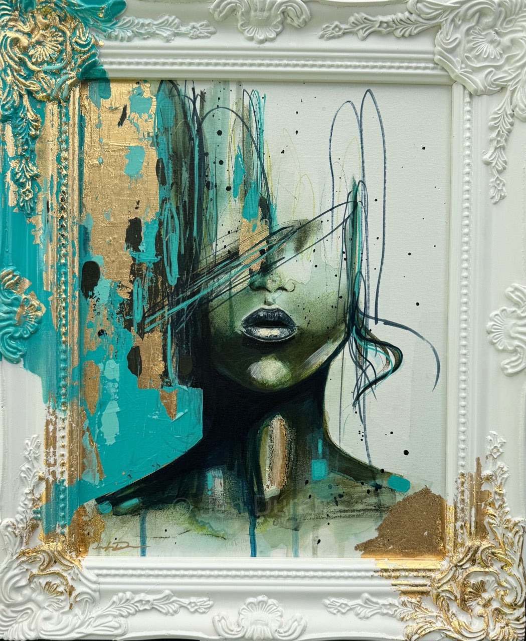 In Consumed by Chaos, raw emotion and elegance collide. The figure’s muted, earthy tones are fractured by streaks of vibrant teal and metallic gold leaf, creating a striking contrast between vulnerability and strength. Delicate yet chaotic lines dance across the canvas, obscuring the eyes and hinting at a mind lost in turbulence, while the mouth remains open as if breathing through the storm.
