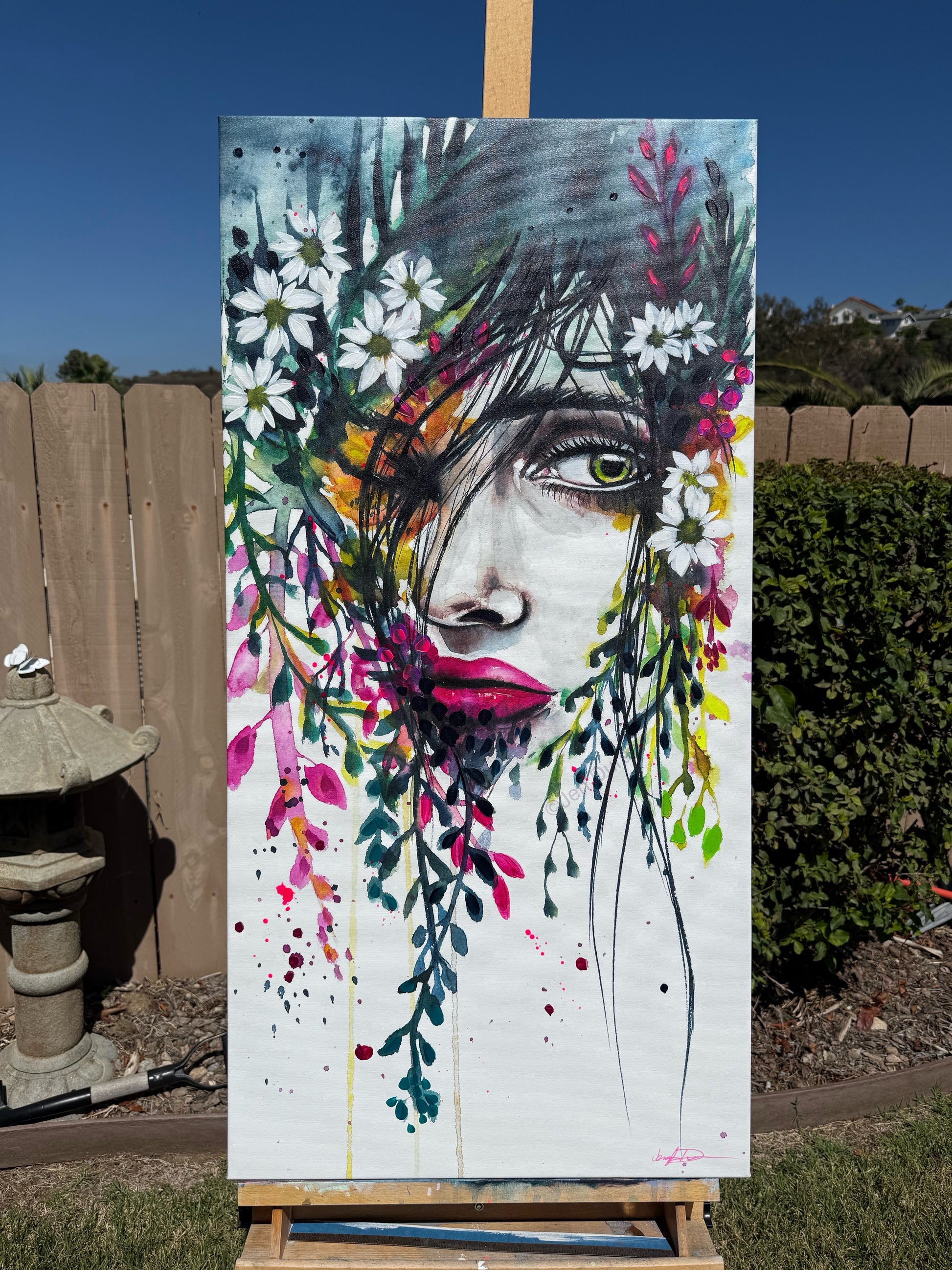 “Curious” is a portrait alive with mystery and wonder. A single green eye peers out from cascading vines, blooms, and streaks of vivid color—pulling the viewer into her hidden world. Layers of bright fuchsia, lush greens, and glowing whites intermingle with flowing strands of hair, symbolizing the tangled beauty of curiosity, growth, and exploration.