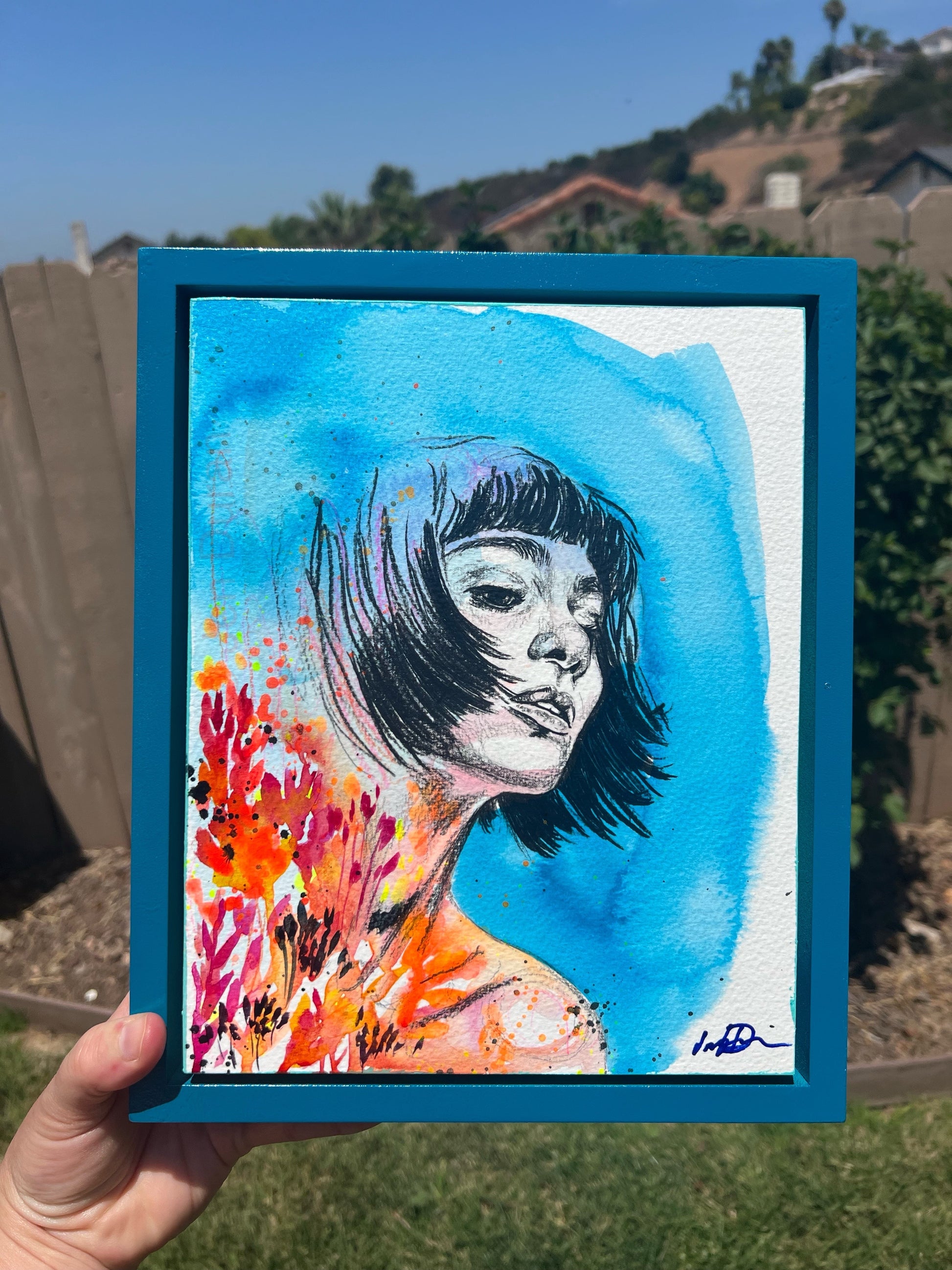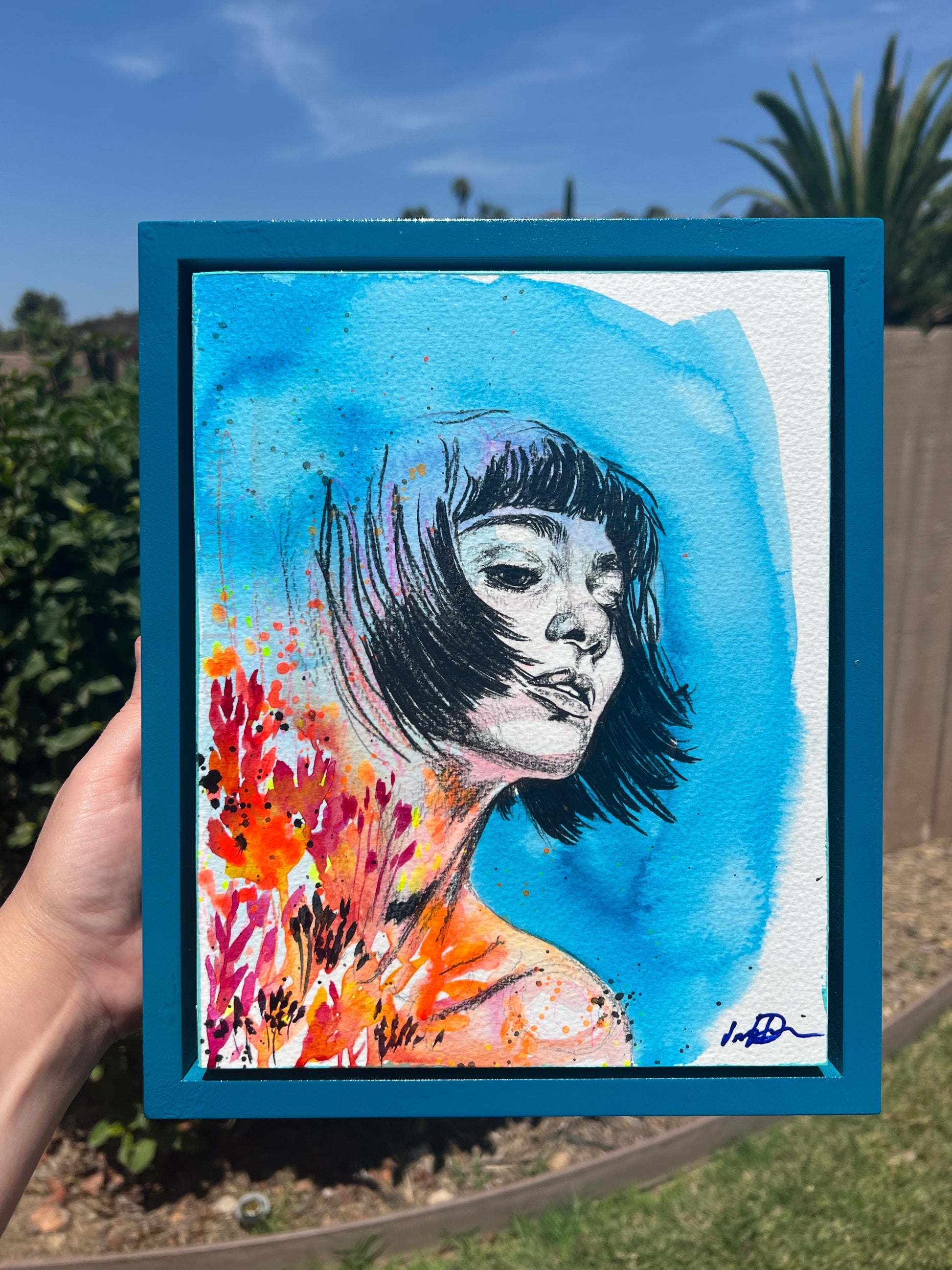 Set against a luminous turquoise wash, this piece captures the precise moment when inner tension gives way to liberation—where stillness meets strength, and softness refuses to shrink.