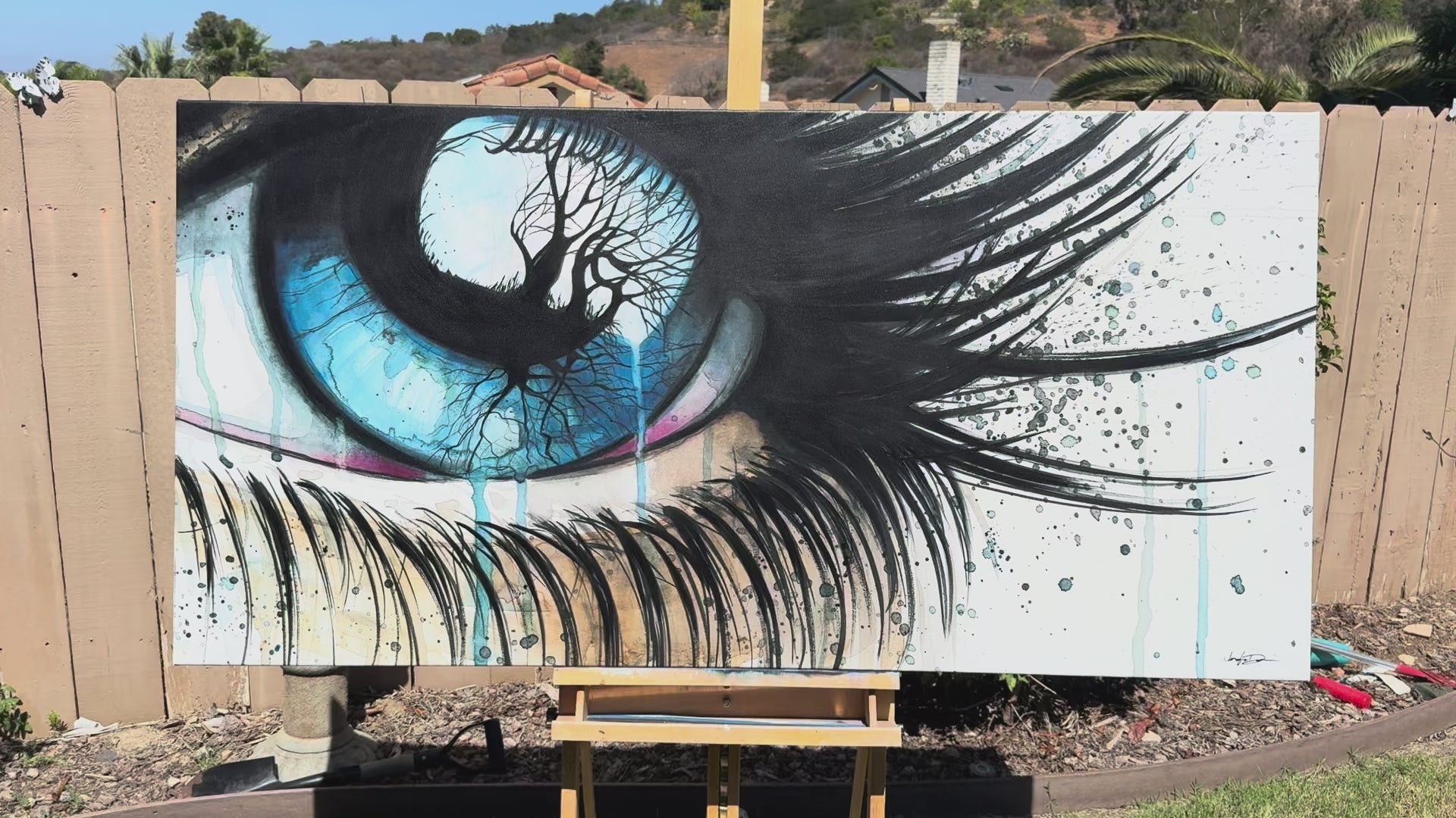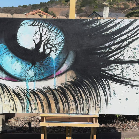 “Desolation” is a haunting exploration of solitude and reflection. A piercing blue eye fills the canvas, lashes radiating outward like dark branches, while within the iris a barren tree stands silhouetted against an endless void. Drips, splatters, and textured layers amplify the sense of grief, resilience, and stark beauty in emptiness. This piece is both vulnerable and strong—a meditation on what it means to endure.