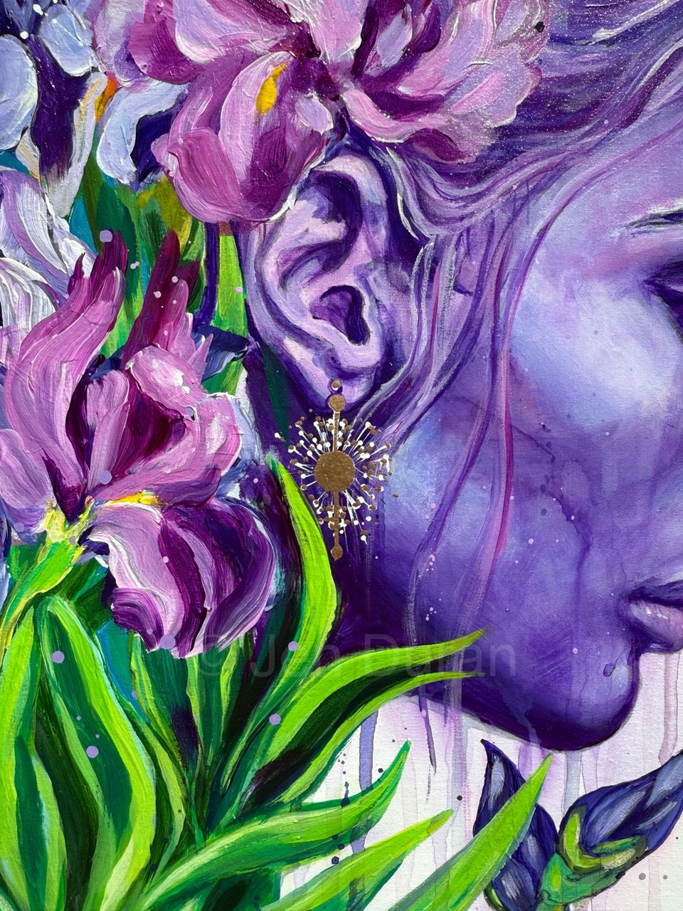In this ethereal painting a serene figure is consumed by blooming irises—an embodiment of quiet strength, renewal, and emotional depth. The face, rendered in violet and lavender hues, appears carved from the very flowers that surround it, evoking both stillness and growth.