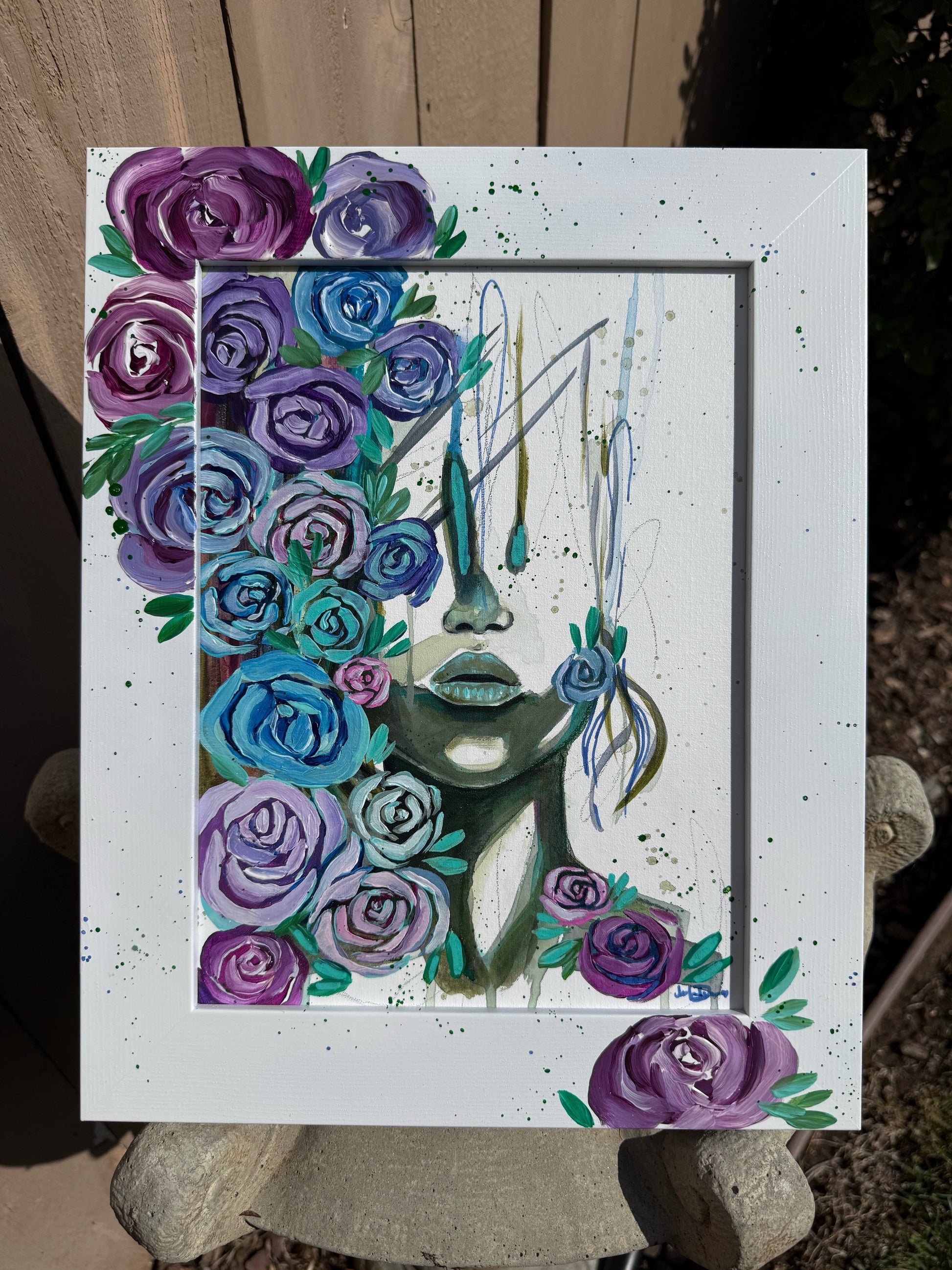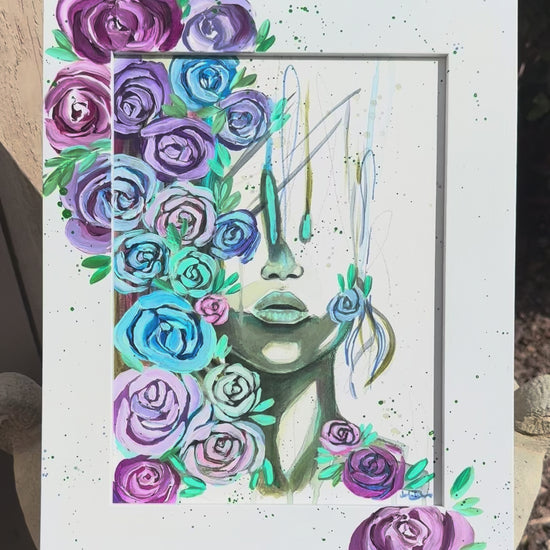 In Flourish, a figure rises from a garden of blossoms—half seen, half becoming. Shades of violet, turquoise, and emerald weave together in lush harmony, symbolizing transformation and renewal. The faceless portrait invites the viewer to step inside the moment of growth—to feel what it means to bloom through vulnerability.