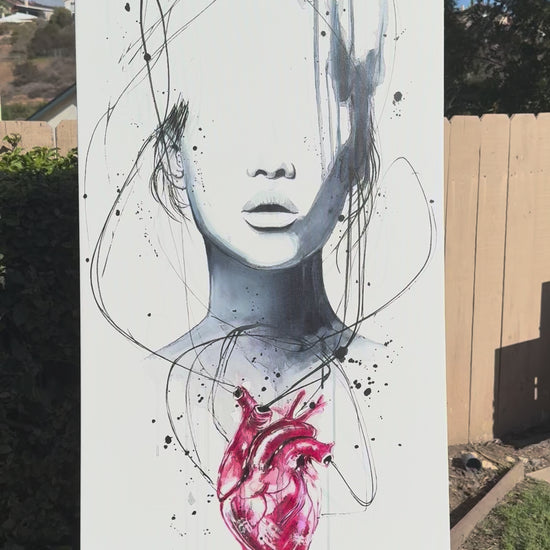 “Heartache” captures the stark intensity of grief and vulnerability. A faceless figure emerges in bold strokes of black and gray, lines looping chaotically around her as though tracing the turbulence of thought. Below, a vivid crimson heart drips with weight and rawness—an unflinching symbol of loss, longing, and resilience. Minimal yet powerful, the composition lays bare the universal experience of pain and survival.