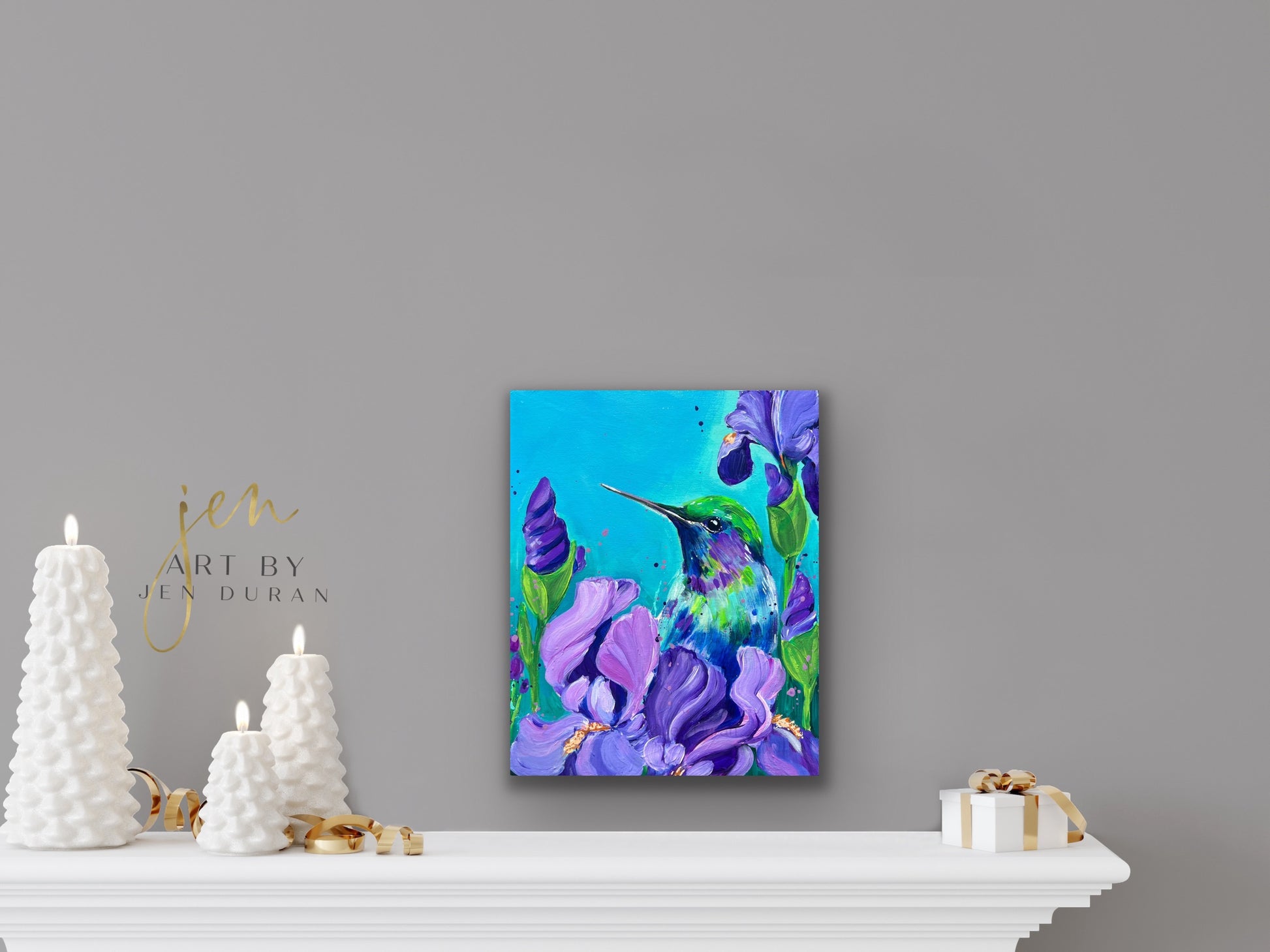 This radiant painting features a hummingbird nestled among a sea of violet and lavender irises, bathed in a brilliant turquoise sky. The bird’s iridescent feathers shimmer in shades of emerald, amethyst, and sapphire, creating a striking contrast against the surrounding blooms. With joyful splashes of color and expressive brushwork, this piece bursts with life and renewal.