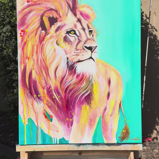 Vibrant and fierce, Ignite captures the strength of a lion bathed in luminous coral, gold, and violet. A powerful symbol of courage and inner fire, this piece radiates energy and resilience.