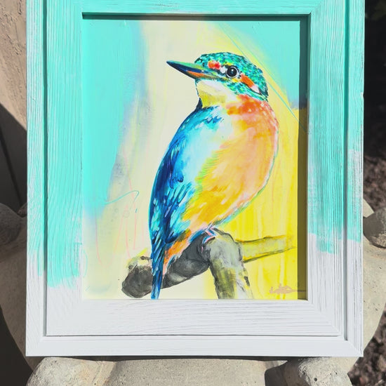 In Morning Song, a brilliant kingfisher greets the day bathed in sunlight and color. Vivid blues, golden yellows, and coral tones harmonize across its feathers, creating a luminous balance between calm and energy. The turquoise frame echoes the sky behind it—fresh, hopeful, and alive.