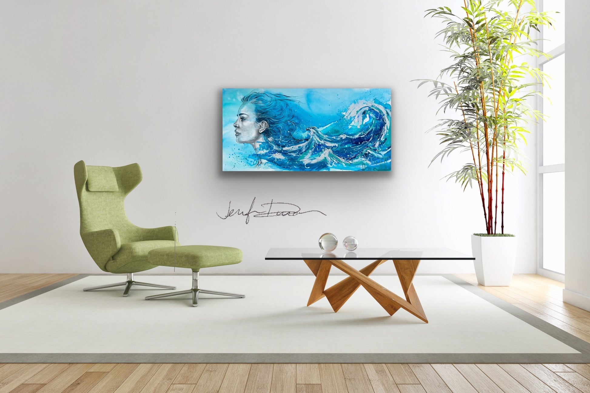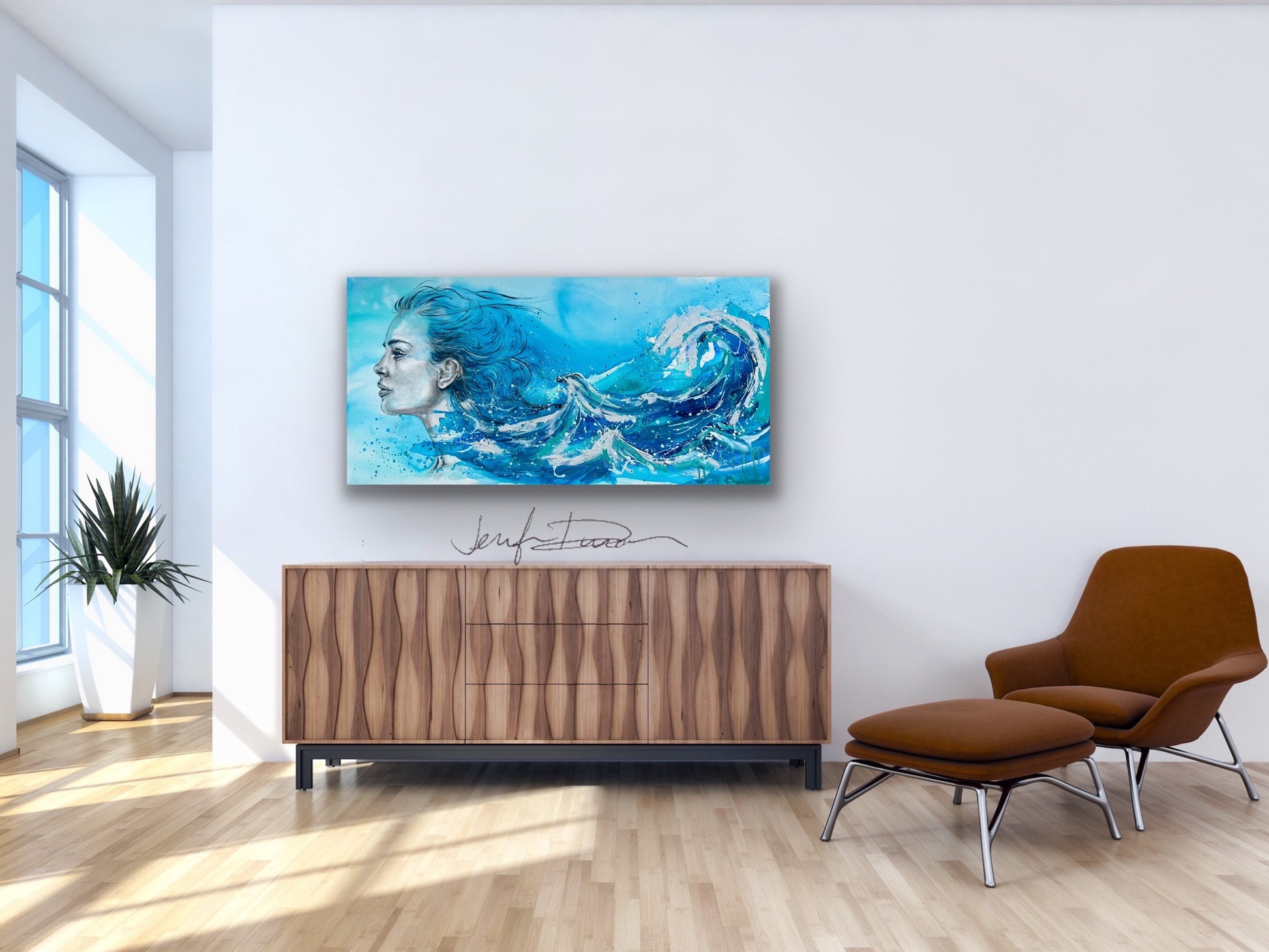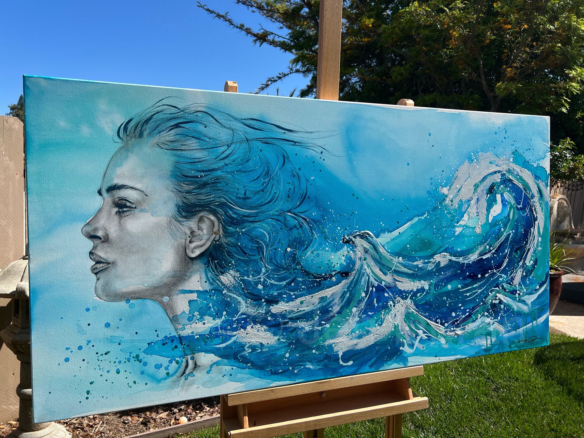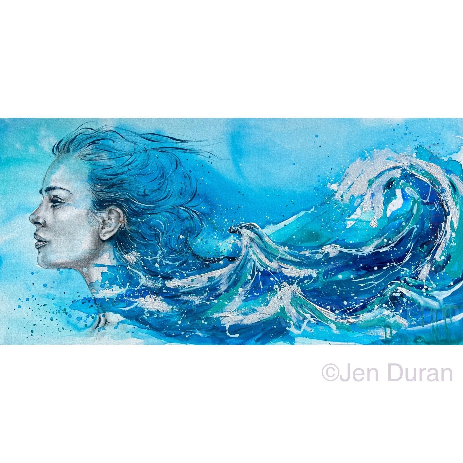 Siren Song captures the moment where ocean and soul become one. With wind-swept hair that dissolves into crashing waves, the figure gazes forwardâcalm, strong, and in motion. This piece pulses with energy: rich teals, deep blues, and foamy whites collide in brushstrokes that feel like sea spray mid-surge. Thereâs a quiet power here, an emotional tide that pulls you inâequal parts grace and wild freedom. She doesnât just exist in the waterâshe is the water.