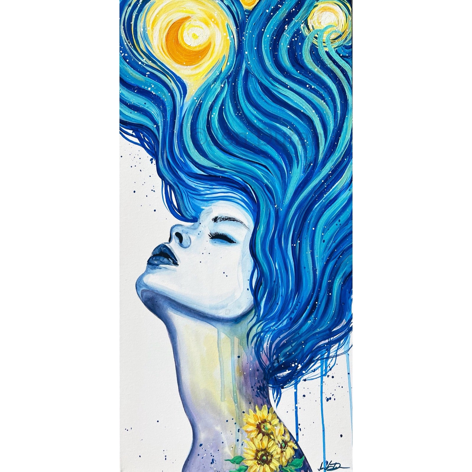 A celestial tribute to Van Gogh’s The Starry Night, this piece reimagines swirling galaxies as flowing strands of hair. With a dreamer’s face tilted skyward in serene surrender, the composition blends cosmic movement with human stillness. Sunflowers bloom at her neck—an homage to another of Van Gogh’s enduring motifs—reminding us that beauty can exist in both the stars and the earth.