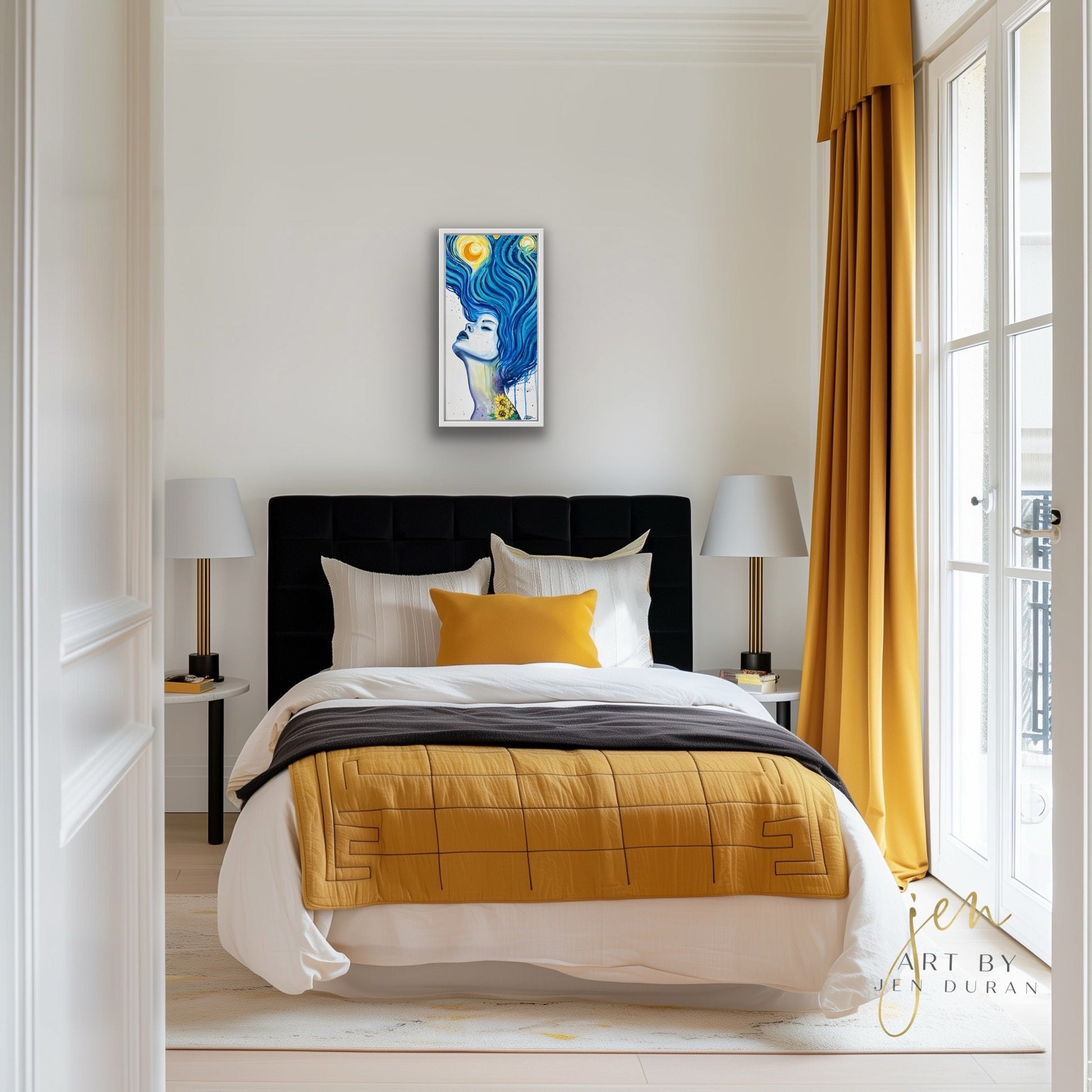 “Created for a Van Gogh tribute show, this painting merges my voice with his legacy—his skies became her thoughts, his stars became her dreams.” — Jen Duran