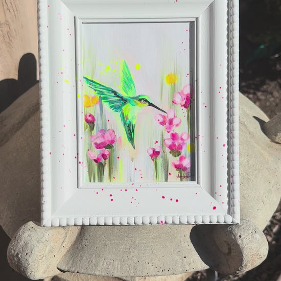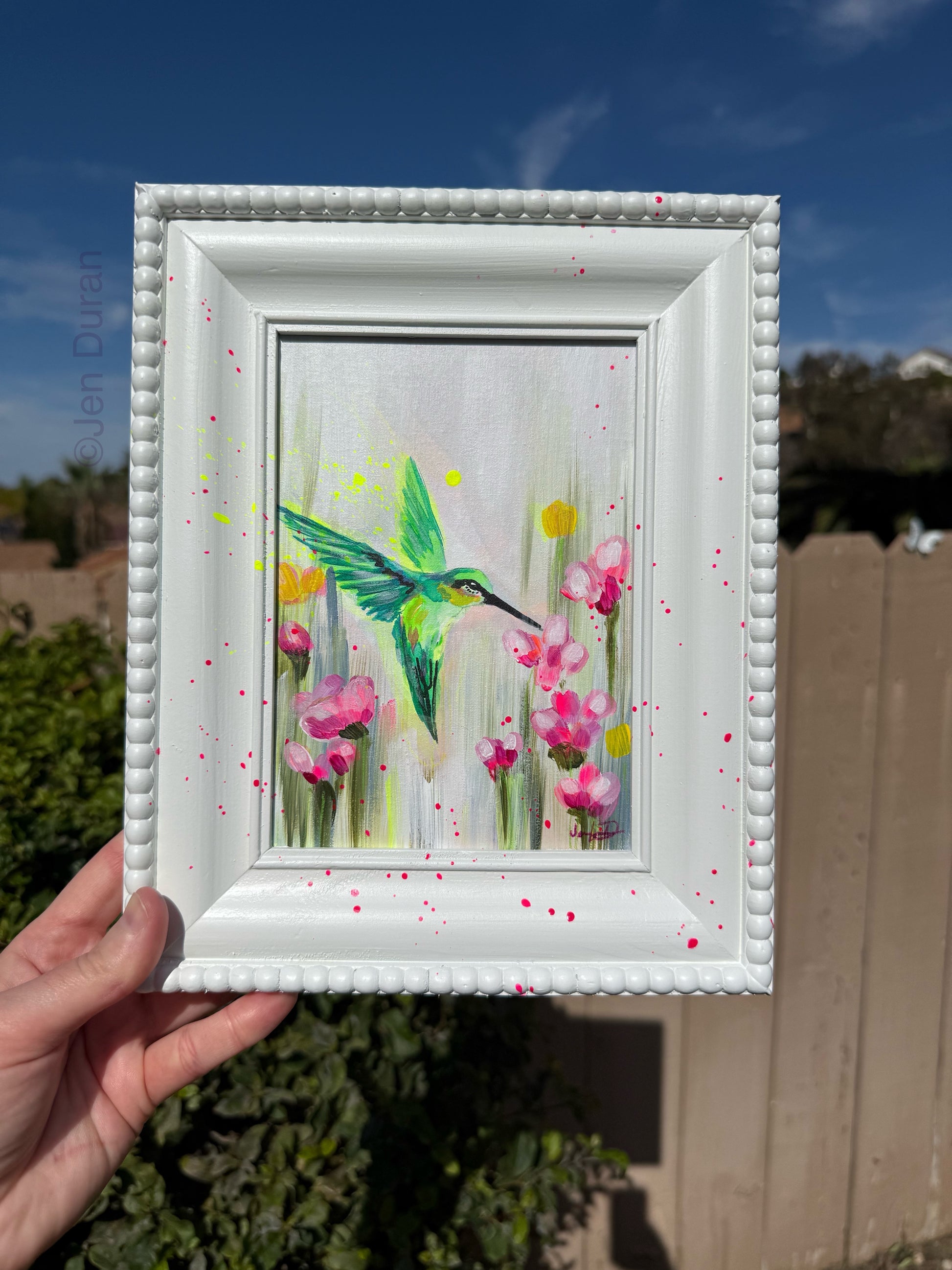 A moment of gentle beauty — a vivid green hummingbird hovers among pink blossoms, embodying grace and joy in motion. Framed in hand-painted white with playful neon splashes, this piece glows with renewal and calm energy.