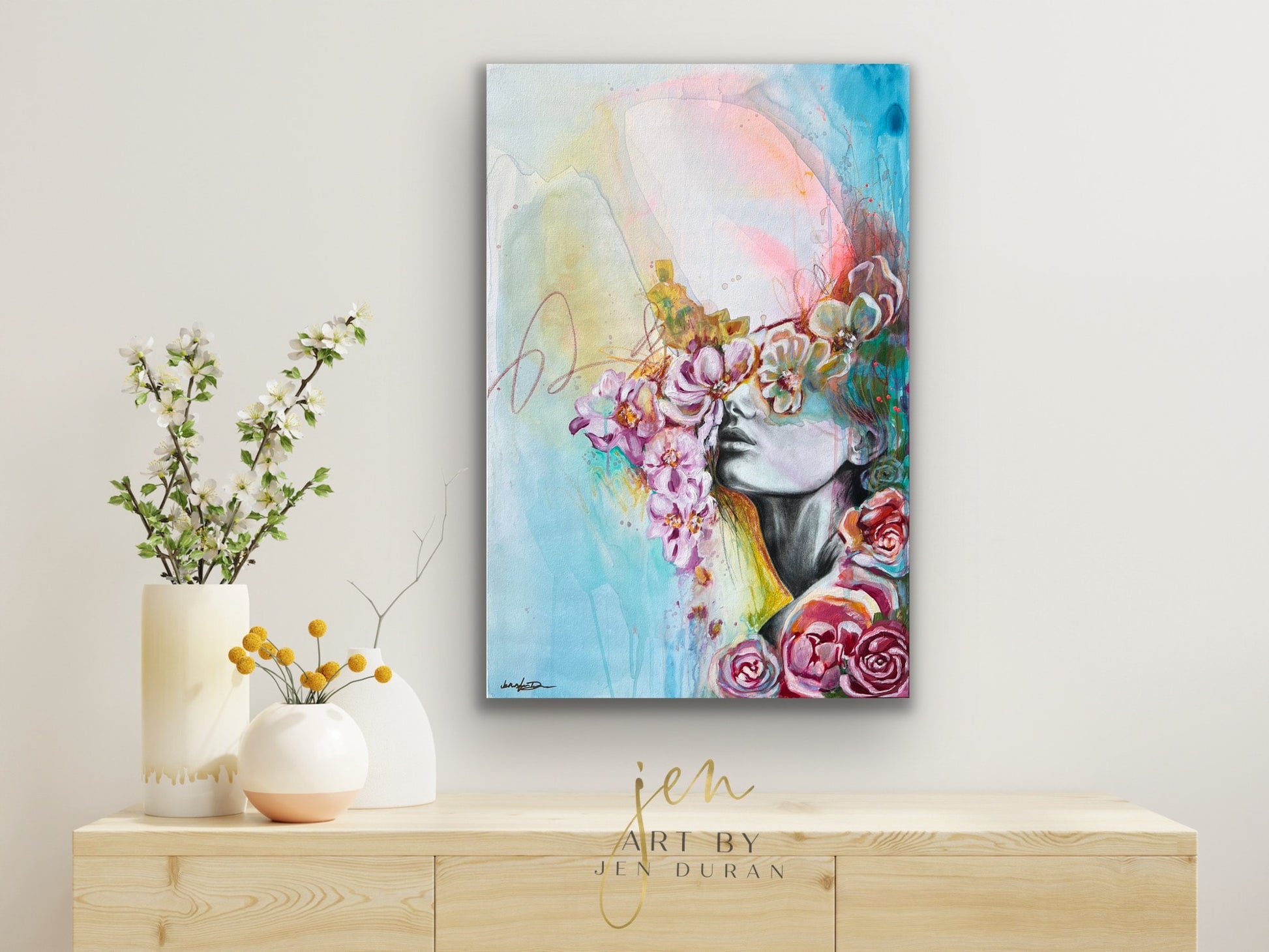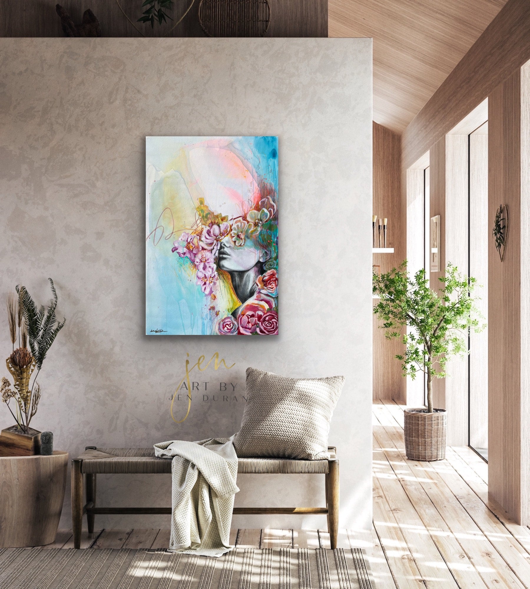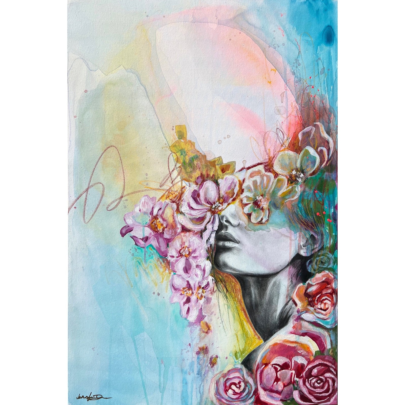 Soft yet surreal, Thoughts Inside a Dream drifts between consciousness and imagination. A grayscale portrait emerges from a lush bouquet of roses and orchids, her eyes hidden beneath blossoms as if shielding her from the noise of the waking world. Radiant washes of pastel blue, peach, and gold spill across the canvas like sunlight through a dream. This piece invites quiet reflection—a surrender to beauty, daydreams, and the mystery of what blooms beneath the surface.