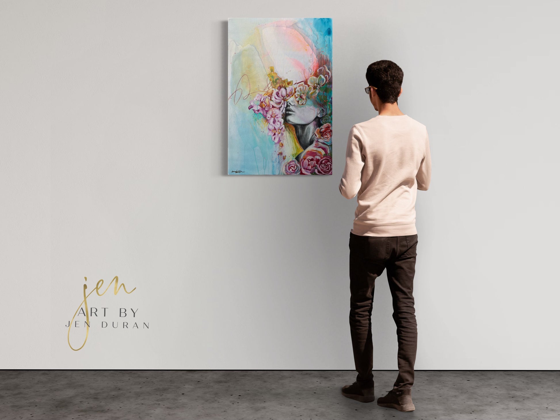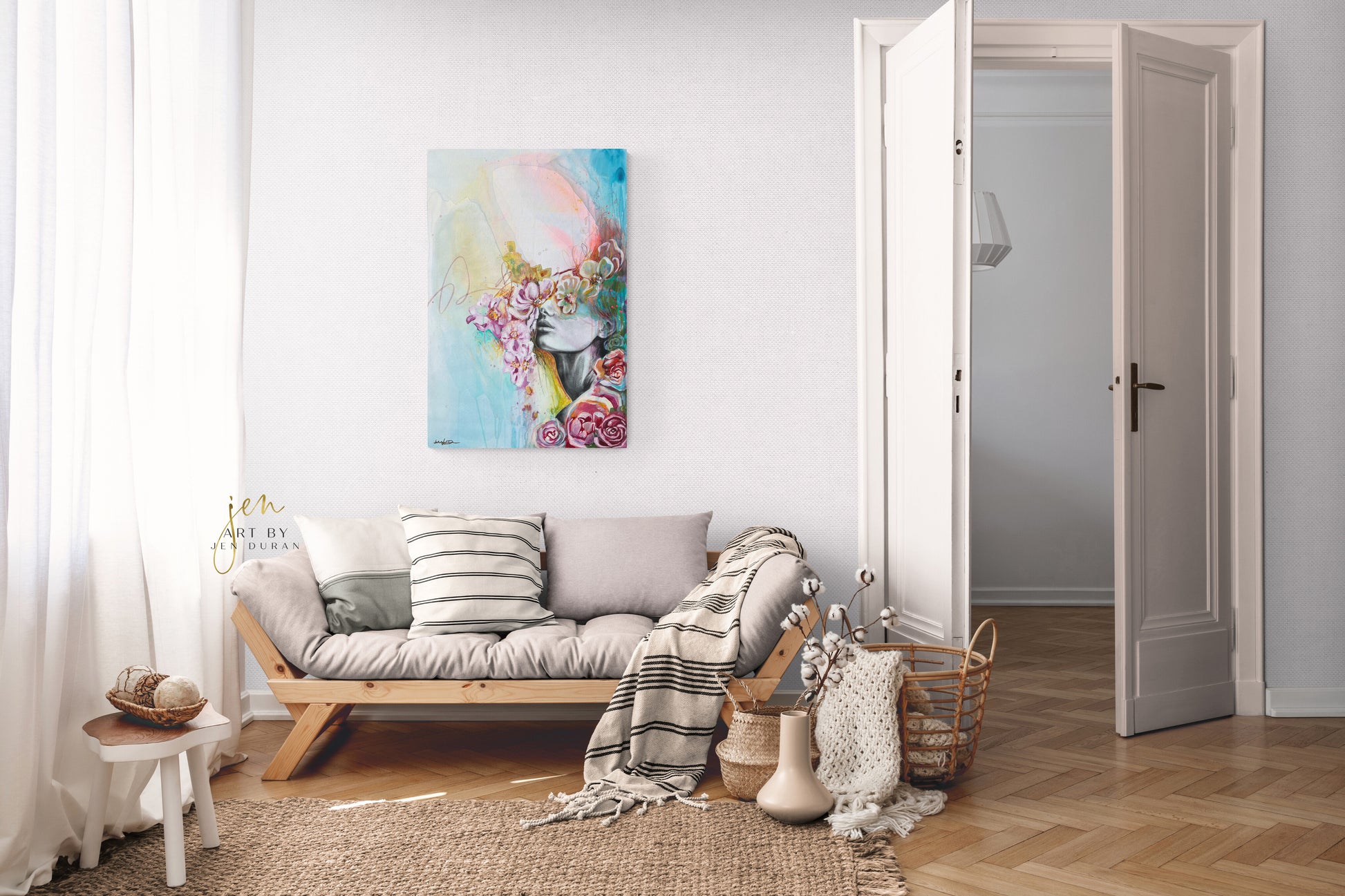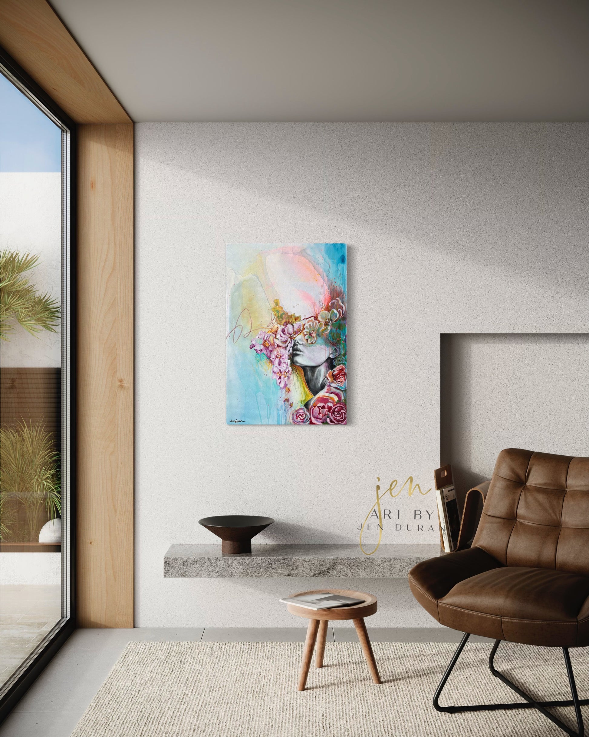 “I created Thoughts Inside a Dream during a time of quiet but powerful transformation. It’s about the inner world we don’t always speak of—the colors, thoughts, and feelings that drift through us like dreams. I wanted her to feel both grounded and ethereal, like she’s blooming from within.” — Jen Duran