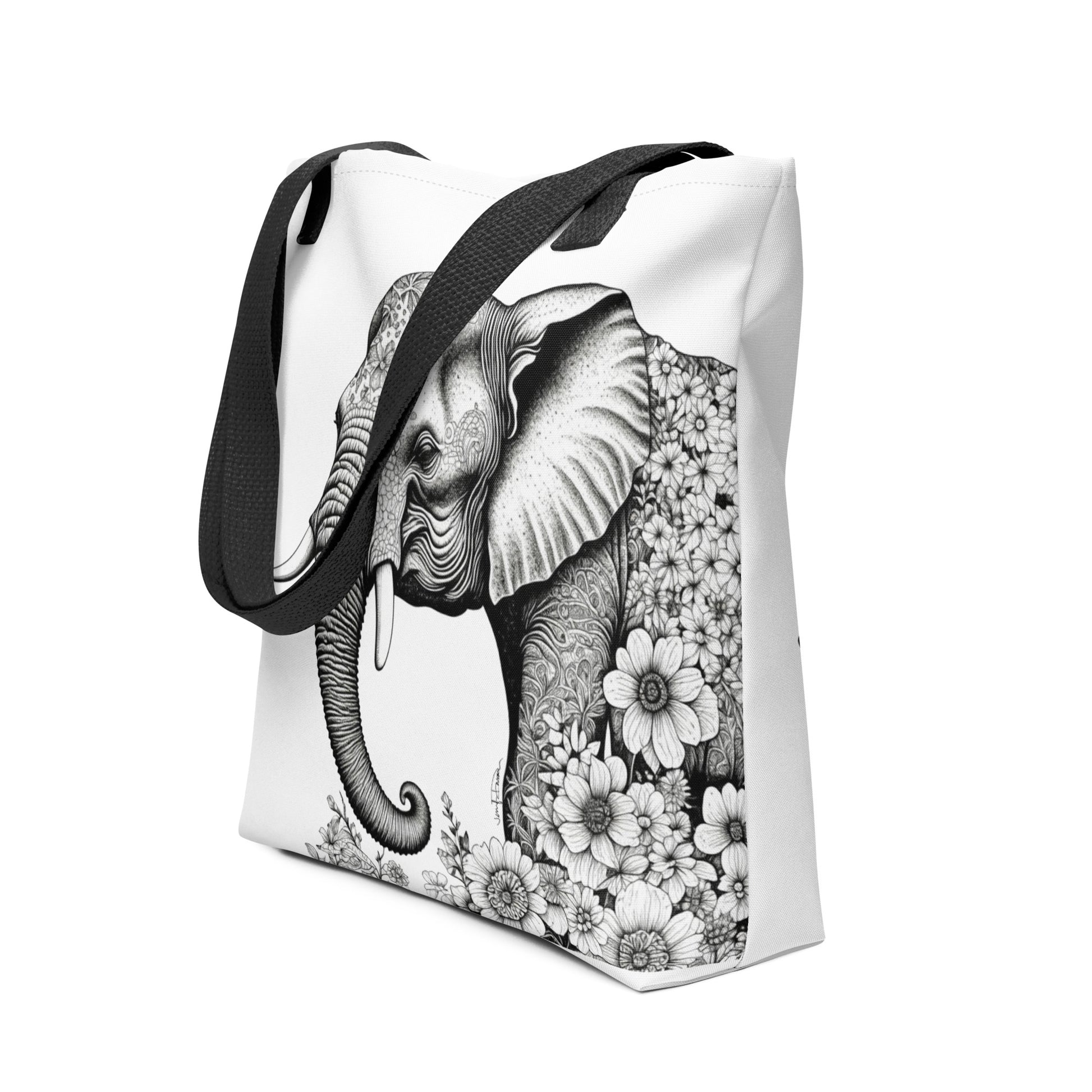 Carry strength, wisdom, and quiet beauty wherever life leads you. Blooming Giant features a detailed black-and-white elephant adorned with lush florals—an elegant fusion of power and gentleness. Its intricate linework brings a timeless, soulful feel to an everyday essential, turning your daily routines into moments touched by art.