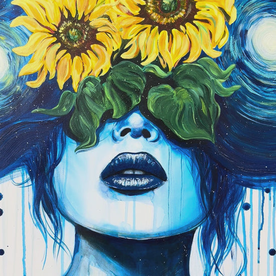 Tribute to Van Gogh is a bold, emotional fusion of two iconic motifs—sunflowers and starlight—woven into a contemporary vision of creative reverence. A celestial blue figure gazes upward, crowned by vibrant yellow blooms, as swirling stars from The Starry Night merge with her flowing hair. It’s a visual meditation on beauty, madness, wonder, and the emotional gravity of art. This piece is not just a nod to Van Gogh’s legacy—it’s a conversation between eras, a portrait of how deeply his vision still lives in us.
