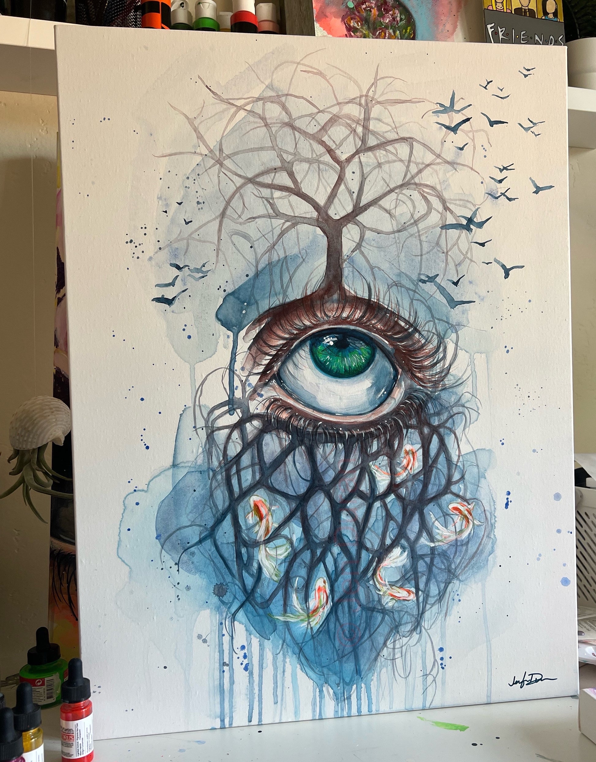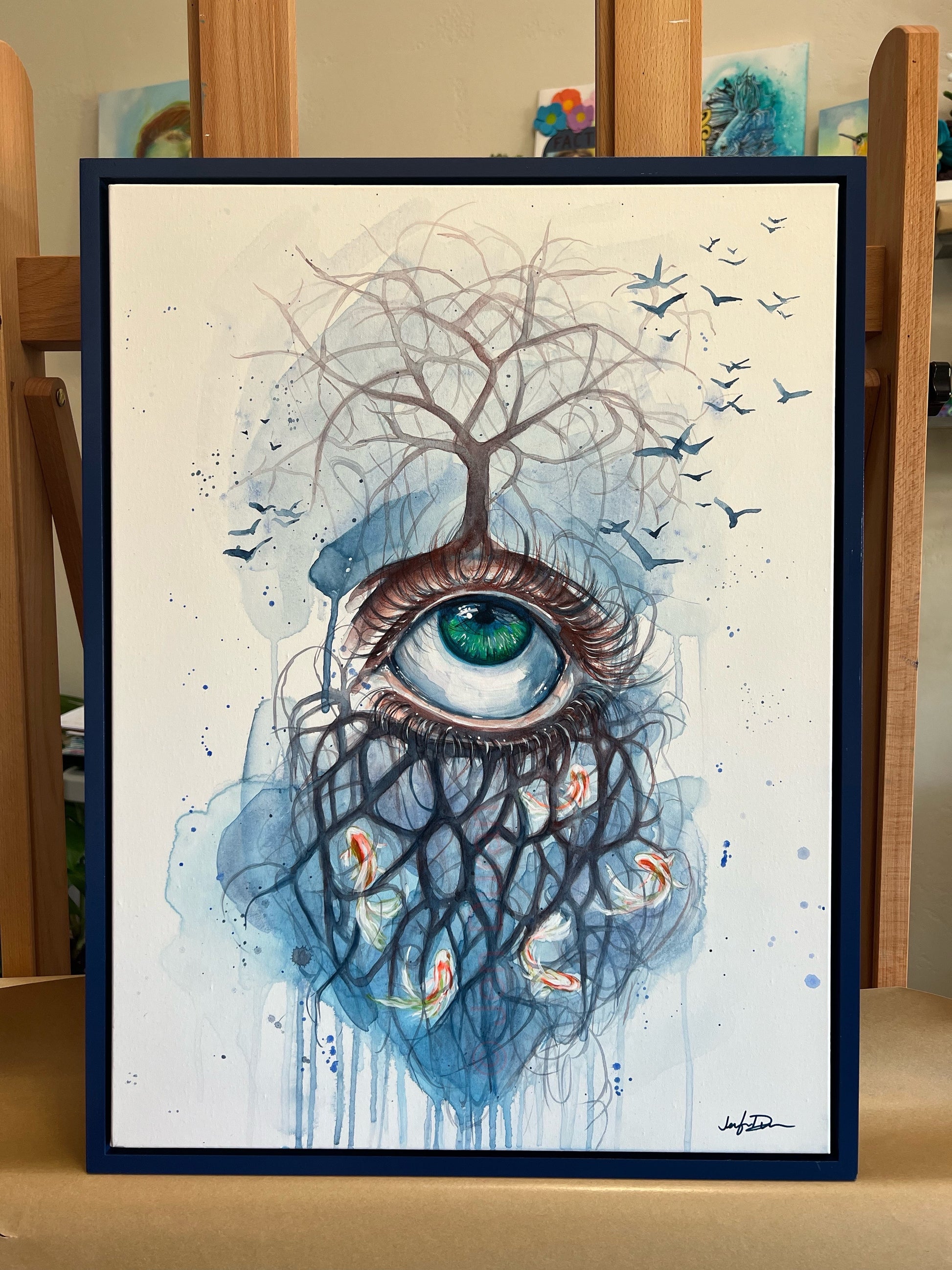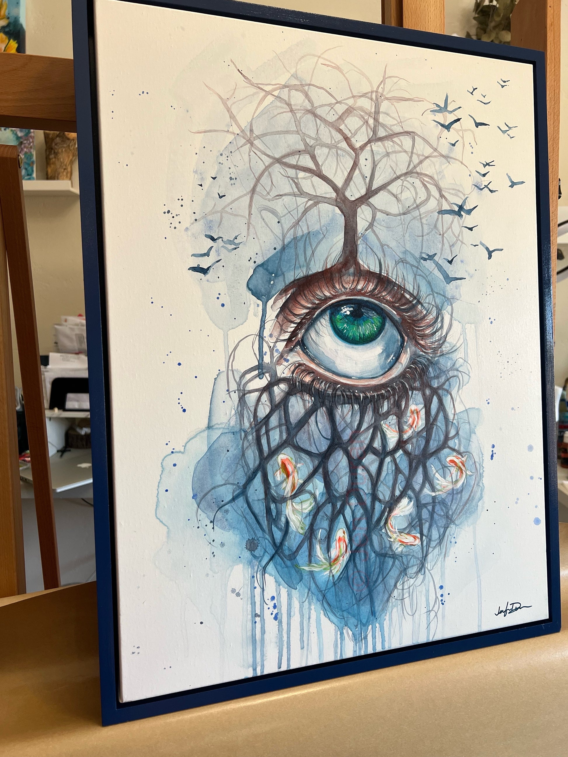 A surreal vision steeped in symbolism, Unbinding presents a single emerald eye from which a barren tree emerges, branching skyward while a cascade of roots descends, entrapping vibrant koi fish. Birds take flight around the crown, suggesting freedom and release. This piece explores the tension between clarity and chaos, entrapment and escape—offering the viewer a visual journey through the subconscious. The composition, with its cool watercolor-like flow and dark organic lines, evokes both dream and transformation.