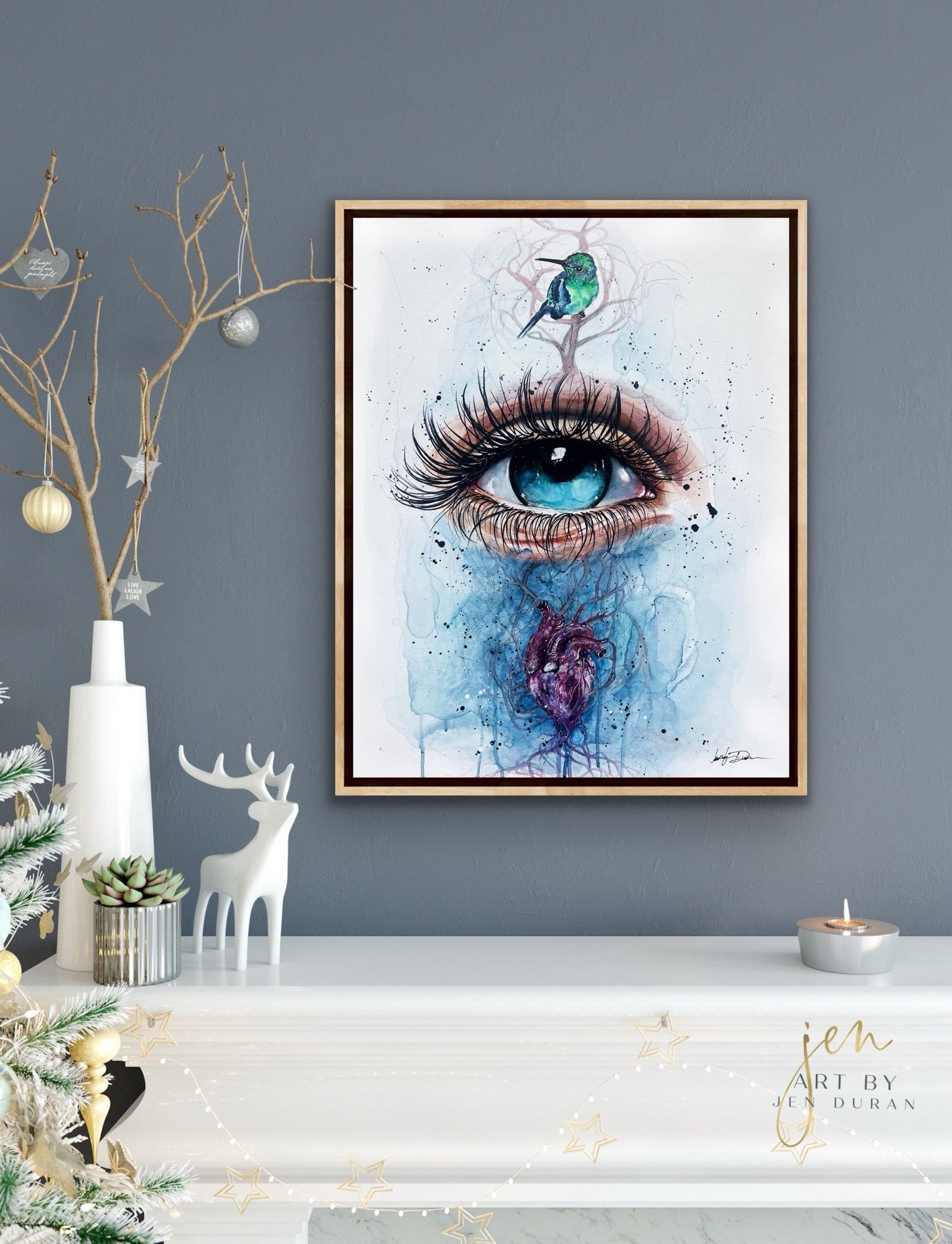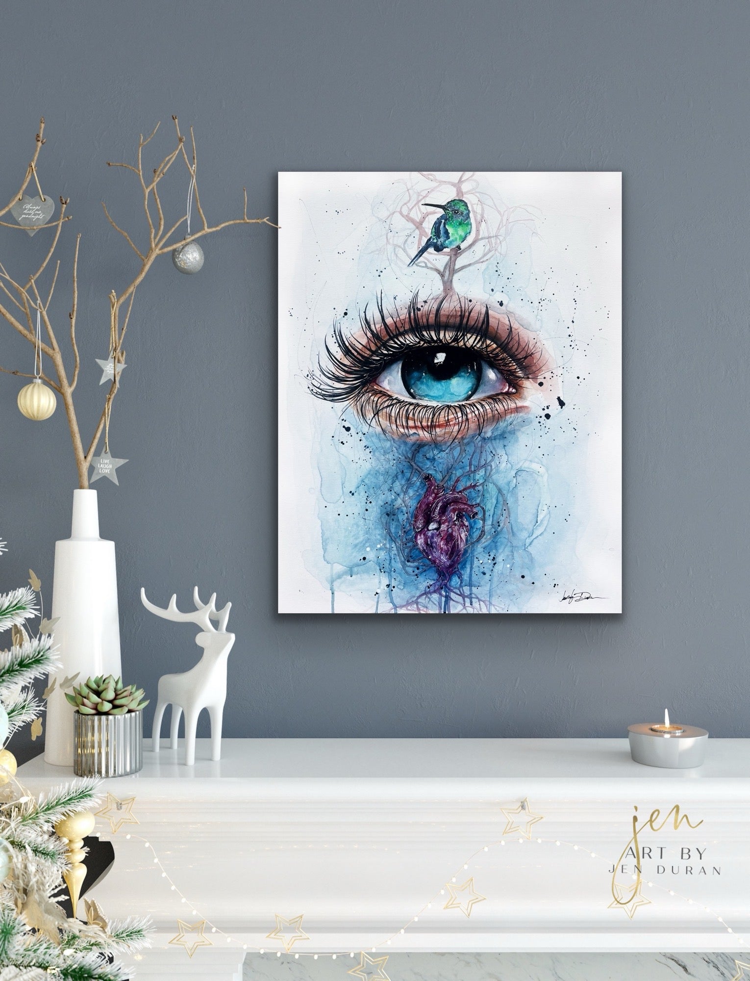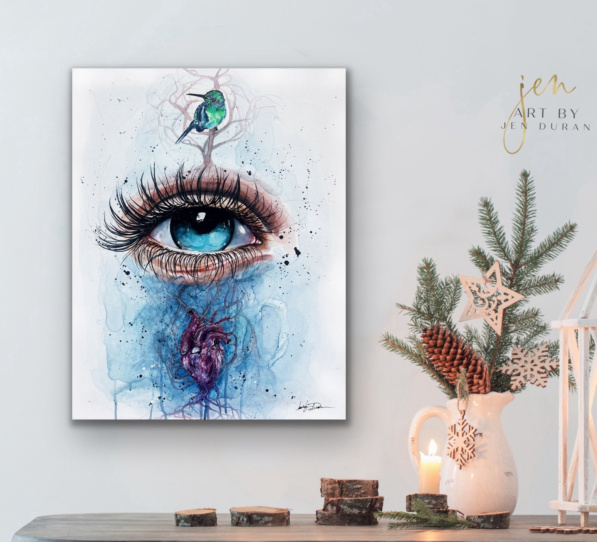 Vagary is an ethereal exploration of the delicate balance between heart, vision, and instinct. A luminous, hyper-detailed eye becomes the central channel of awareness, rooted above by a perched hummingbird and below by a vivid anatomical heart. Watercolor flows in cool blues and purples, while tangled ink veins and splatters evoke the chaos and beauty of inner connectivity. The hummingbird—light and watchful—sits atop the visual cortex like a fleeting thought or fragile hope, guiding the way through emotion and uncertainty.