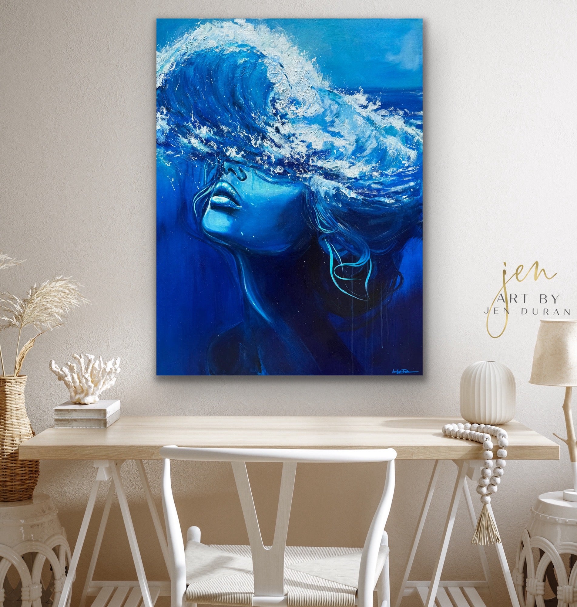 “I painted Wayfinder during a time when I had to trust something unseen—something inside. The ocean in this work is not drowning her—it’s part of her. It is her. The metallic details glint in unexpected ways, reminding us that even the roughest waters reflect the light when we dare to face them.” — Jen Duran